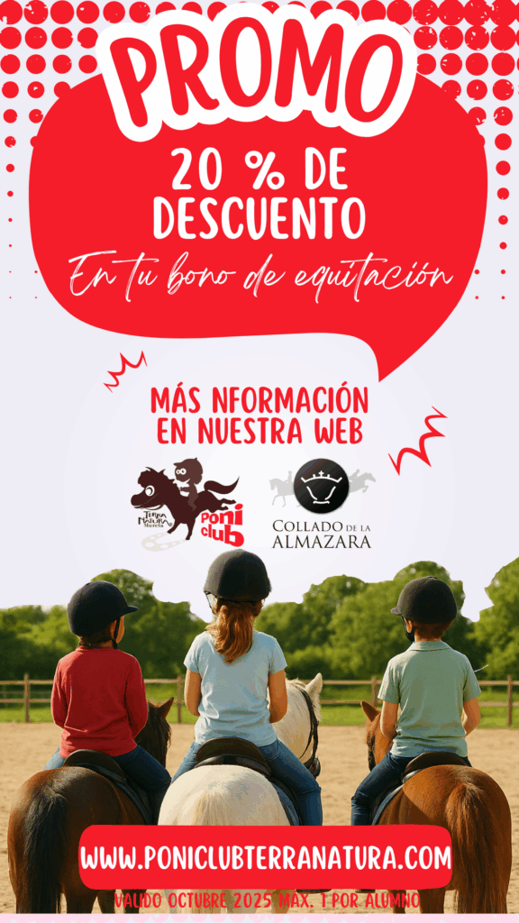 Durante todo el mes de octubre 2025, en PoniClub Terra Natura lanzamos una promoción exclusiva de bonos de equitación. Aprovecha esta oportunidad para disfrutar de un bono de 4 clases de equitación en pleno corazón de Murcia con descuento, ideales para niños y niñas a partir de 5 años de cualquier nivel y disciplina.